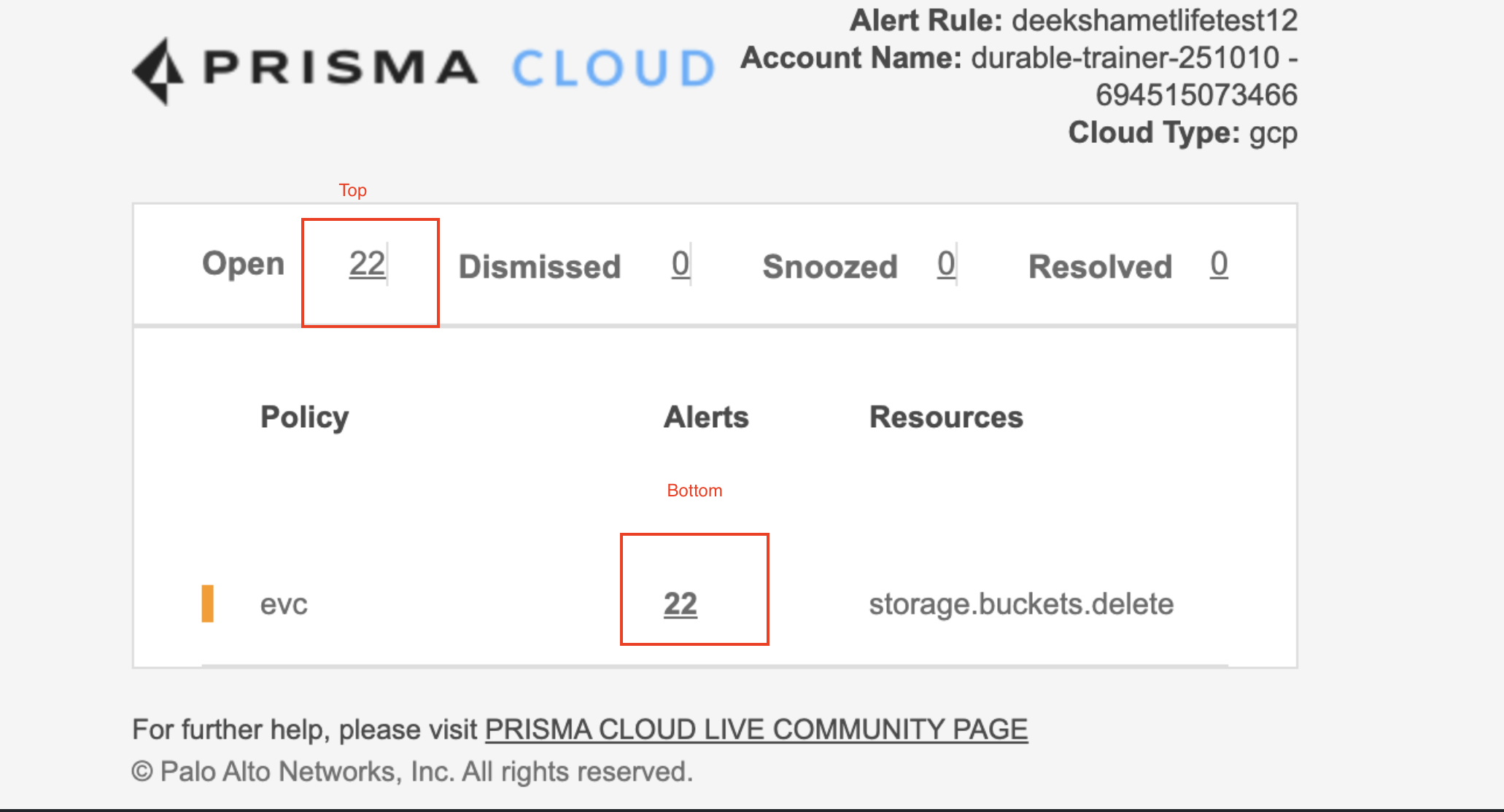 - クラウド アカウントが無効になっている場合、cloud.account フィルター条件は適用されず、そのため、トップ リンク (ポリシー名フィルターがない) では、異なるクラウド アカウントの別のポリシーに関するアラートが表示される場合があります。