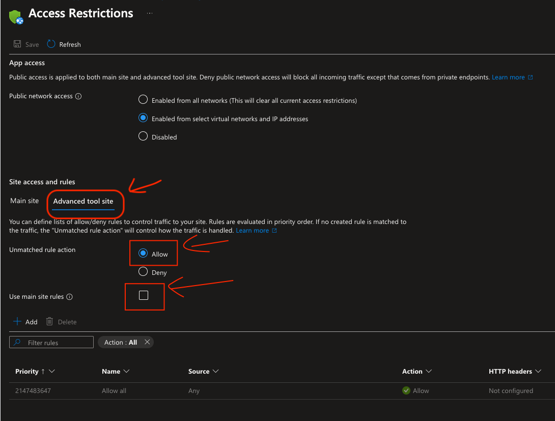 还要检查“高级工具站点”选项卡。我们需要对不匹配的规则采取允许操作。如果没有,我们需要允许与主站点类似的 Prisma IP 地址或使用主站点规则。此处“高级工具站点”中的规则优先于主站点允许规则。