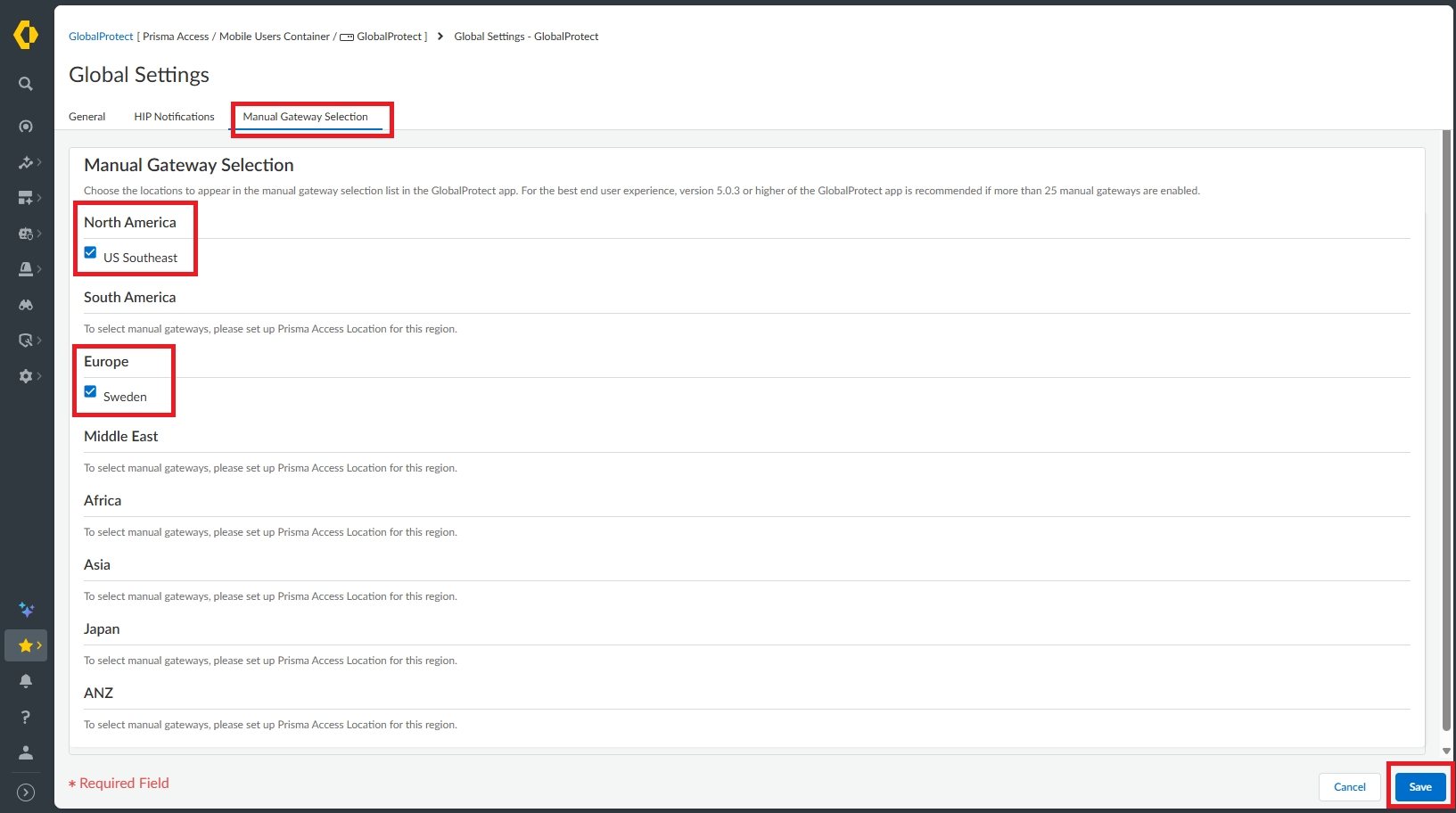 5) Enable the checkbox for Prisma Access Location(s) under respective regions.