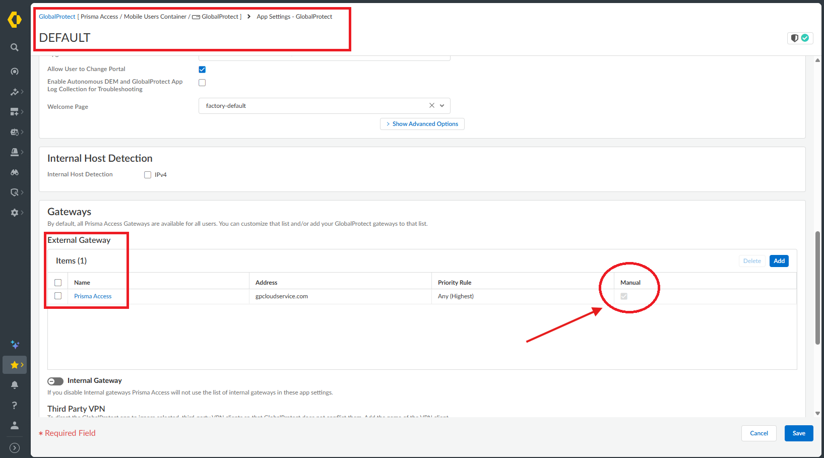 Make sure that the Manual checkbox under Prisma Access entry is checked. If that is not checked (It is enabled by default), Edit and enable it.
