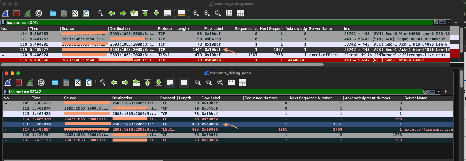 During the SSL/TLS handshake, the firewall is unintentionally removing the IPv6 flow label from large "Client Hello" packets. This causes the destination server to view the handshake attempt as invalid and terminate the connection with a TCP Reset (RST).