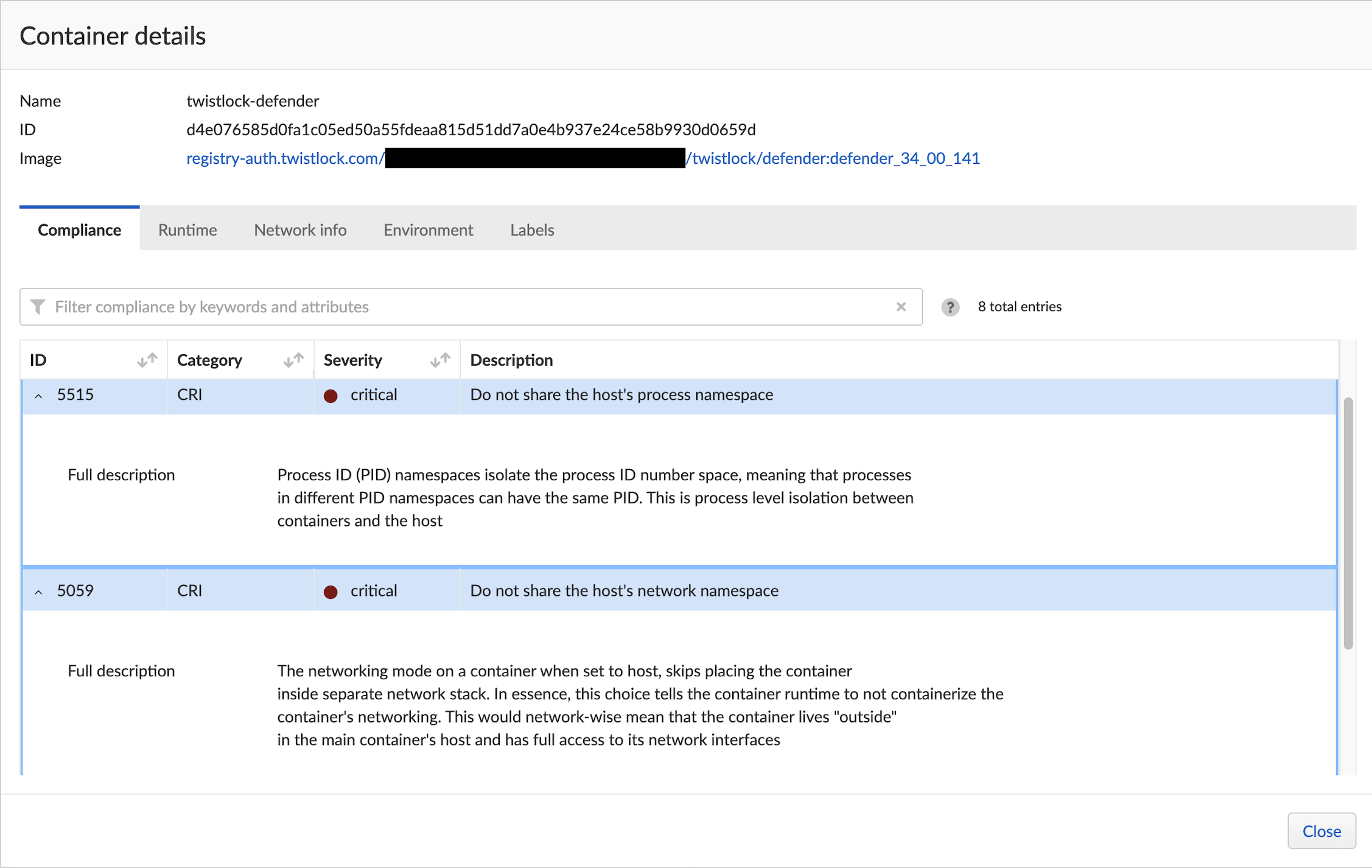 Prisma Cloud Defender is being reported for the following compliance findings: