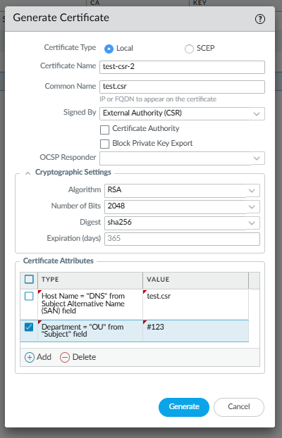 - CSR generated with the certificate attribute and including invalid value, like "#". In this sample, "#123" is specified as Department(OU) value.