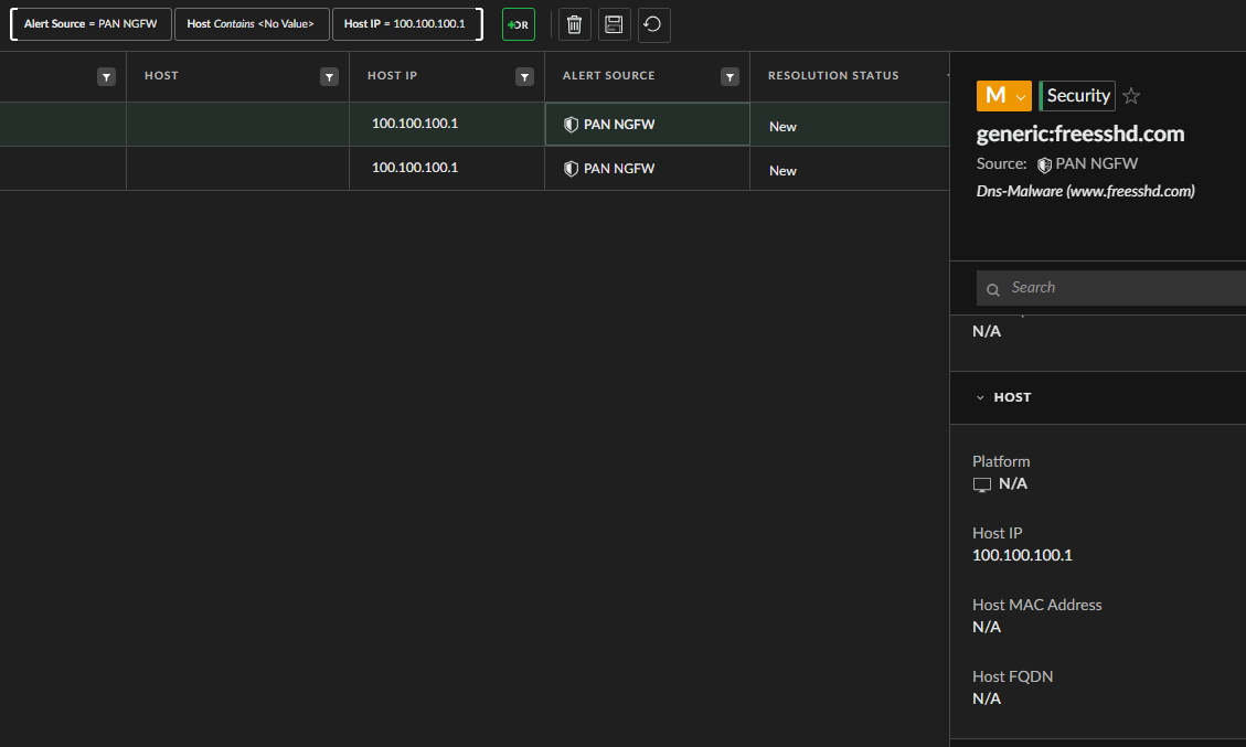 Example of a NGFW alert displaying Hostname being empty even though a Host IP is identified