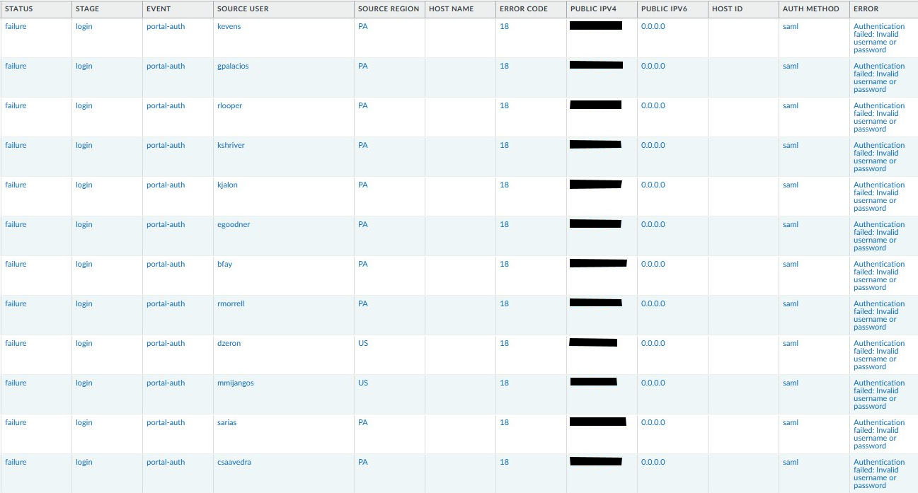 • Observing multiple log in attempts on the GlobalProtect portal
