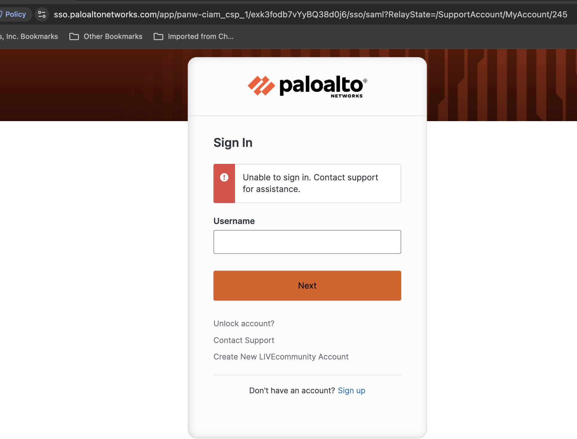 You need to create a Palo Alto Networks SSO password. If you do not have the Forgot password? option, click Unlock Account. If you can create a new password via the verification code you got, do so.
