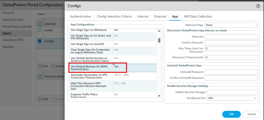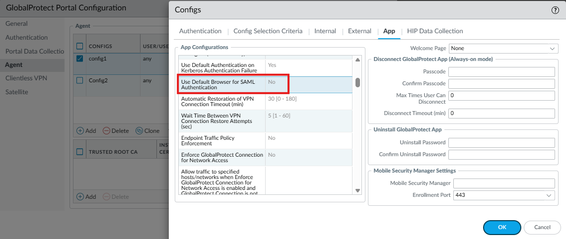 - If any Agent App configuration has “Use Default Browser for SAML Authentication” enabled, all Client Authentication entries for that portal will have “Use Default Browser” enabled after the upgrade.