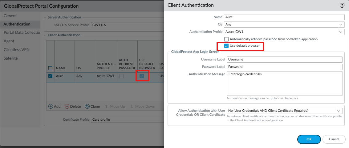 - To disable this feature after the upgrade, Navigate to GlobalProtect Portal Configuration > Authentication > Client Authentication and uncheck “Use Default Browser.”