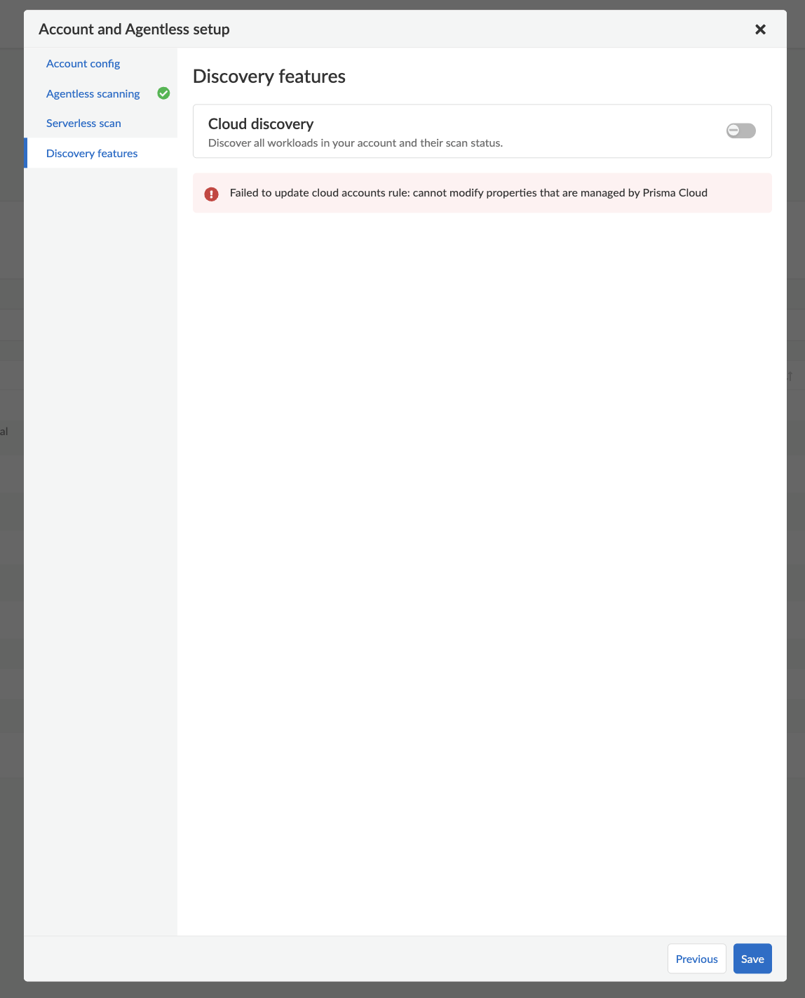 Failed to update cloud accounts rule: cannot modify properties that are managed by Prisma Cloud