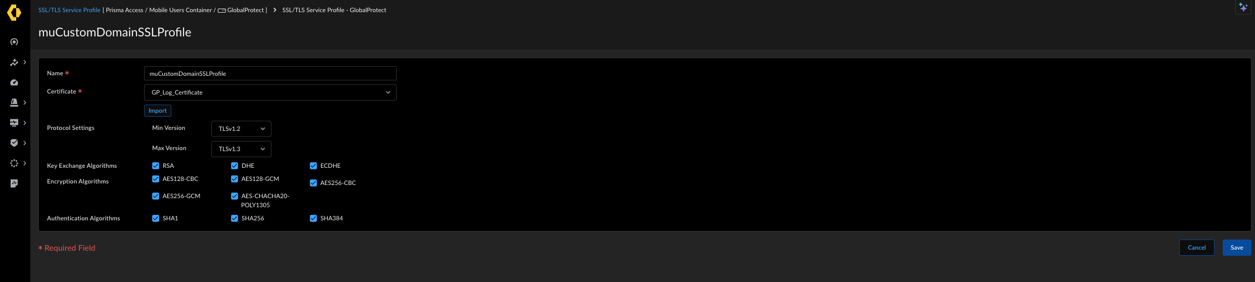 - Navigate to Manage -> Configuration > NGFW and Prisma Access -> change configuration scope to GlobalProtect (top of page) -> Objects -> Certificate Management -> SSL/TLS Service Profiles -> "muCustomDomainSSLProfile".