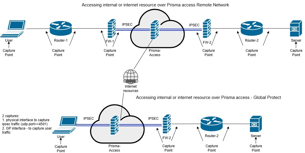 - Ipsec traffic - Ipsec/ESP traffic between on-prem firewall [or other device] and Prisma Access side (by TAC - end user traffic or/and IPSEC traffic). When using Global Protect Client, captures need to be collected at physical interface (ipsec traffic) and global protect interface (end user traffic)