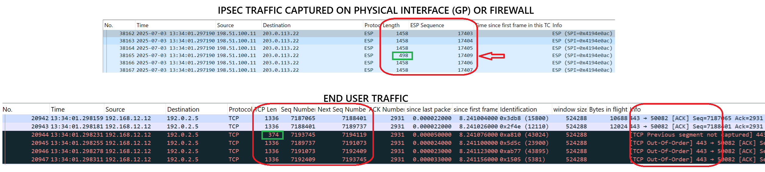 - example of out of order IPSEC/ESP traffic that cause user traffic to be received out of order - VPN device encrypt traffic and send it in correct order but device between VPN peers re-ordered them.