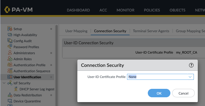 GUI: Device > User Identification > Connection Security > User-ID Connection Security > User-ID Certification Profile > None