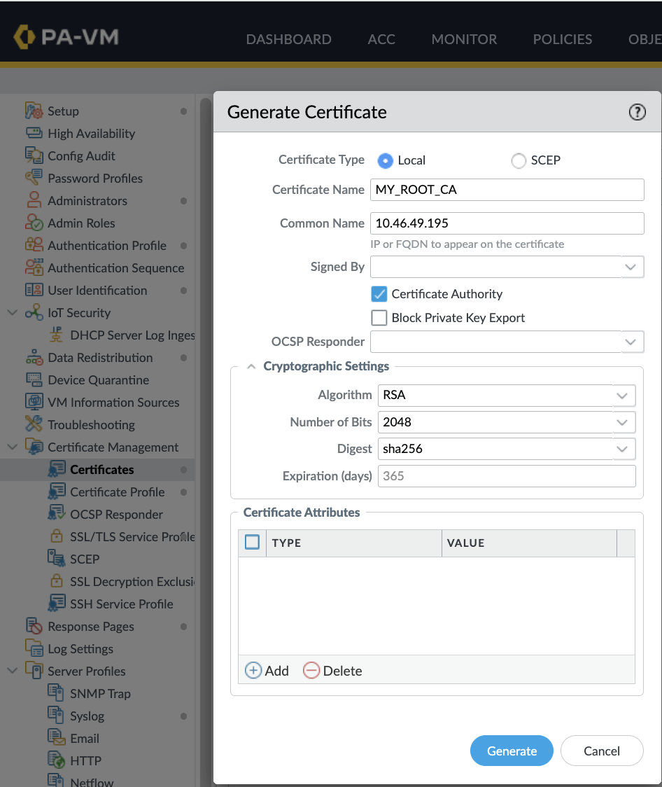 - Create a Root Certificate in the firewall by navigating to Device > Certificate Management > Certificates > Generate and fill out the following parameters: