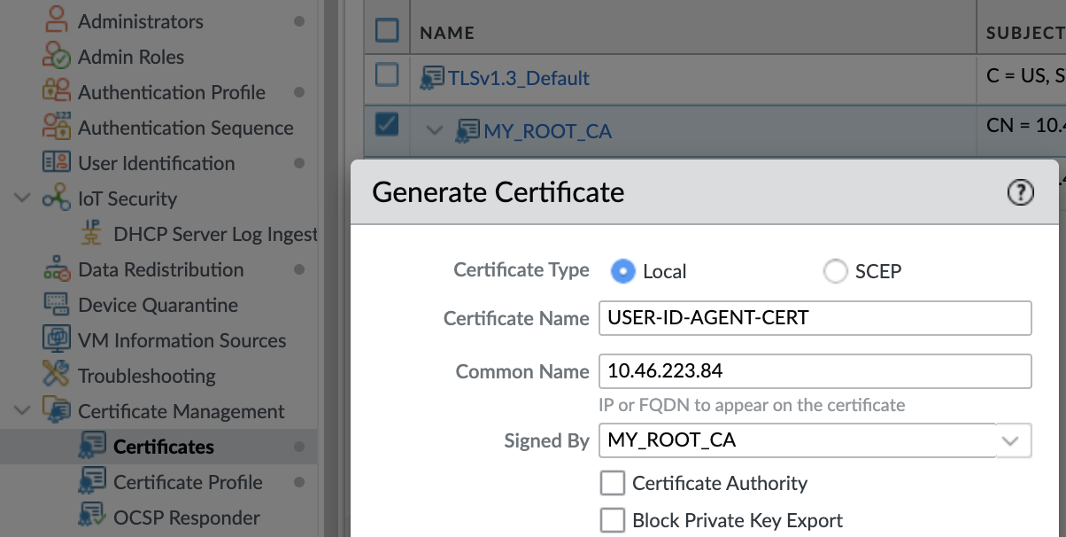 - Generate User-ID agent's Server Certificate, go to Device > Certificate Management > Certificates > Generate and fill out the following parameters:
