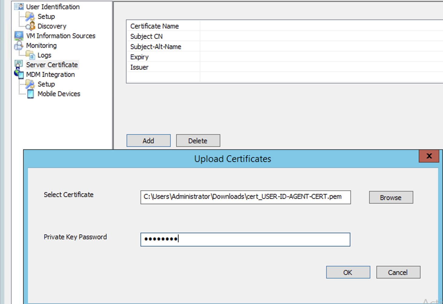 - Configure the User-ID agent's server certificate, by going to Server Certificate > Add.