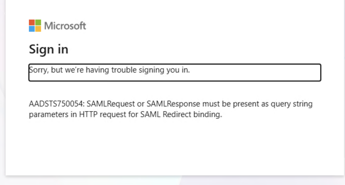 Why after enabling IDP the user is seeing an error "AADSTS750054 - SAML Request or SAMLResponse must be present as query string parameters in HTTP Request for SAML Redirect Binding" when enabling Microsoft Entra ID on Strata Cloud Manager :