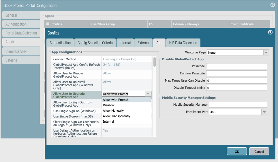 - If the portal status is Using cached portal config (i.e. GP App is Using cached portal config), none of the Allow User to Upgrade GlobalProtect settings would upgrade the GP App.